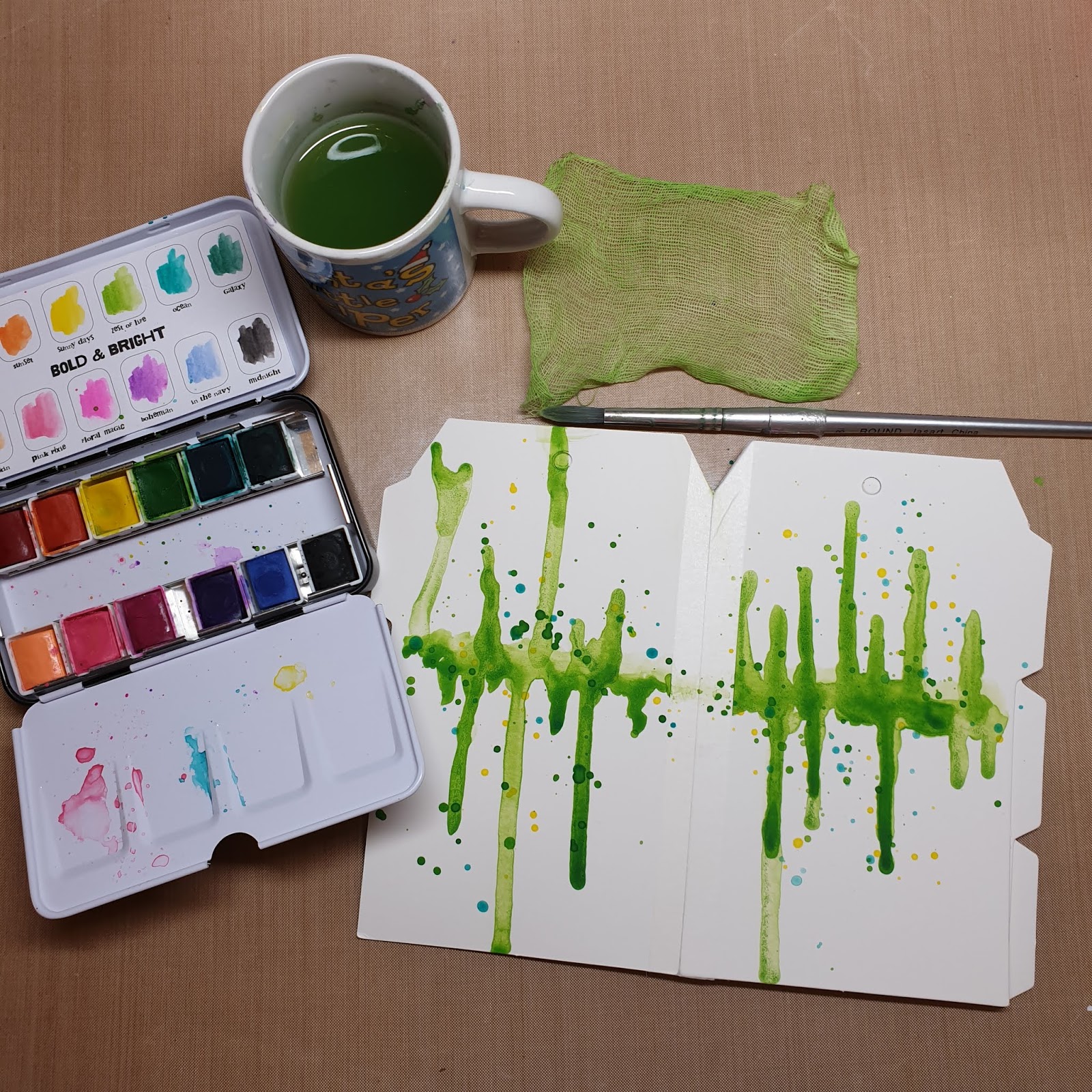 For the inside of my tag journal I decided to create each page opening in a predominantly single colour (monochromatic), taken from the colours along the spine. So the first pages were lime-green in colour. I used the Art-By-Marlene watercolour pan paints - Bold and Bright and let the paint drip up and down the page.